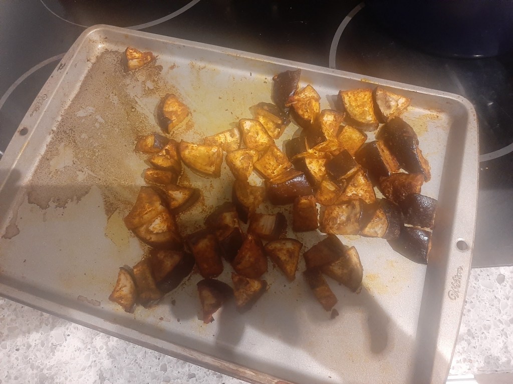 - 4. heat up oven to 400 F and bake eggplant for 20-25 minutes until it looks somewhat dried up and the interior is brown.