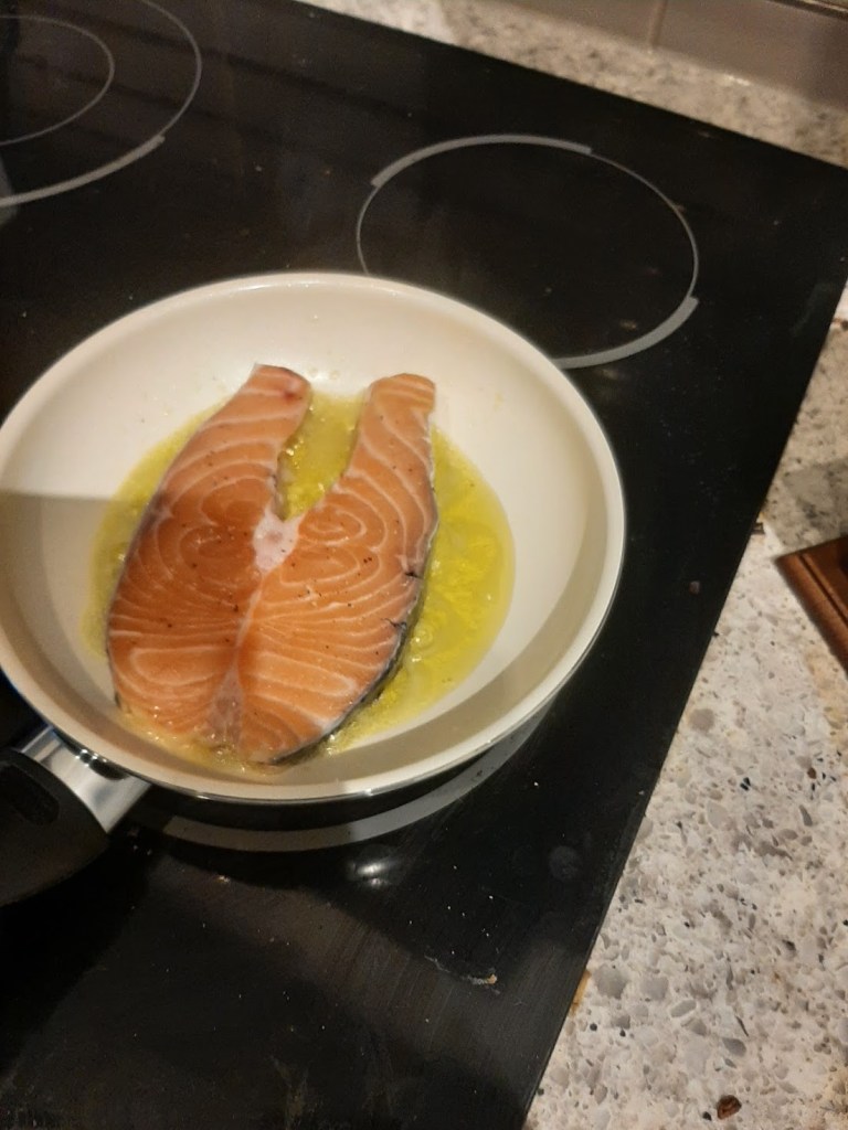 3. Add in the Salmon (I used the filet parts but any part of the Salmon will do; make sure to add skin first though) into the frying pan. Turn down to medium heat.